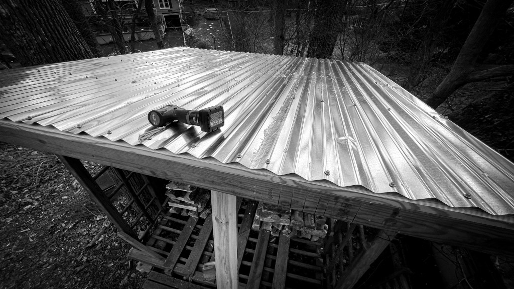 Oliver helped me with the corrugated roofing, the only part of the shed that wasn’t reclaimed. We screwed the metal down as the sun set, fairly sure of our success as the light ran out.