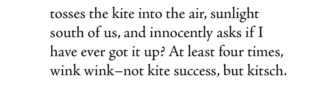 “How about, ‘kite-ish?’” I said, “and I call the poem ‘Kitsch’. Or vice-versa?”
