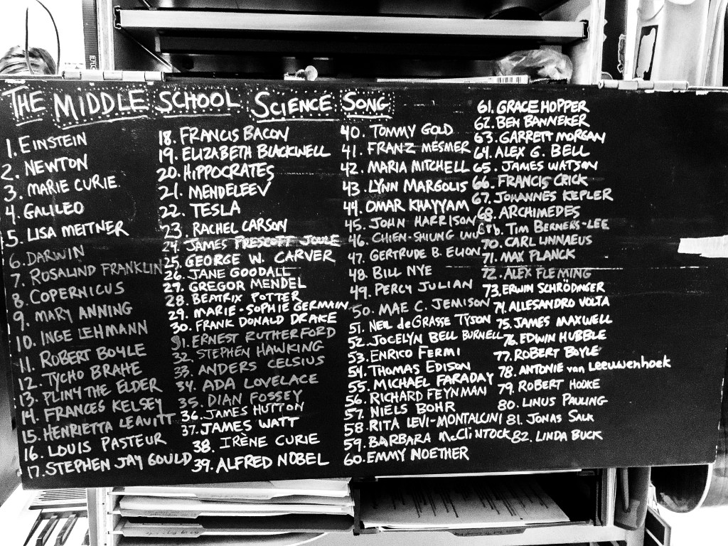 As a middle school science teacher, I wrote many songs that I performed in class. The culmination of these was “The Middle School Science Song” that I wrote in my final year of teaching middle school science six years ago. I wrote a new verse every day and started class off singing the newest verse along with the chorus, “Science class goes way too fast/Science class yes I wish it lasted/all day ok yes I’m trying to say/I love science class the best”.