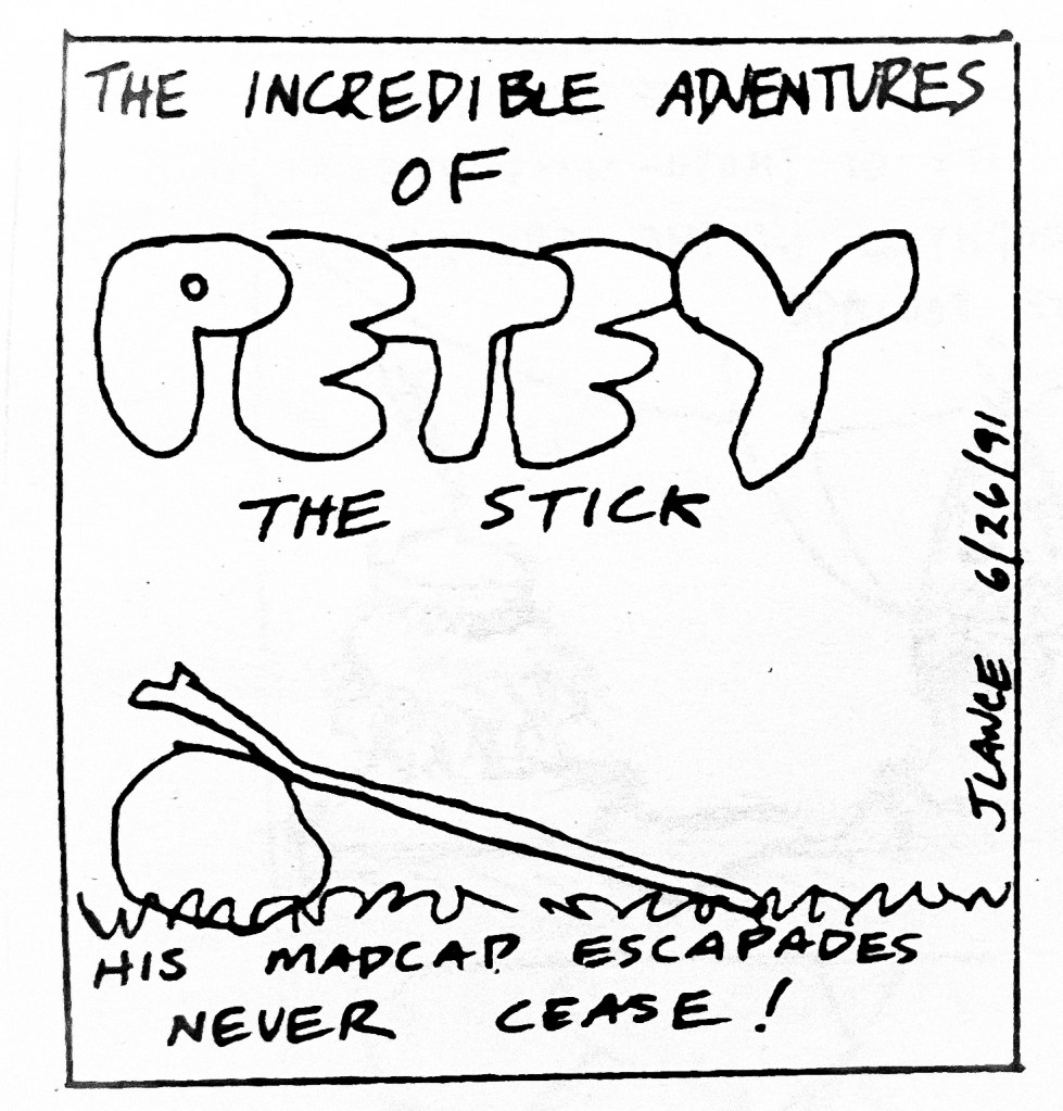 As for my cartooning dream, as a summer camp counselor I also was editor of the weekly camp newspaper, The Clocktower Times. At the point I took it over it was a biweekly effort that mostly had cabin reports from the counselors. I assigned articles to my fellow staff members and established columns for many of them. I began to write a comic strip called “Petey the Stick” that followed the life of Petey as he navigated the turmoils of being a piece of wood.