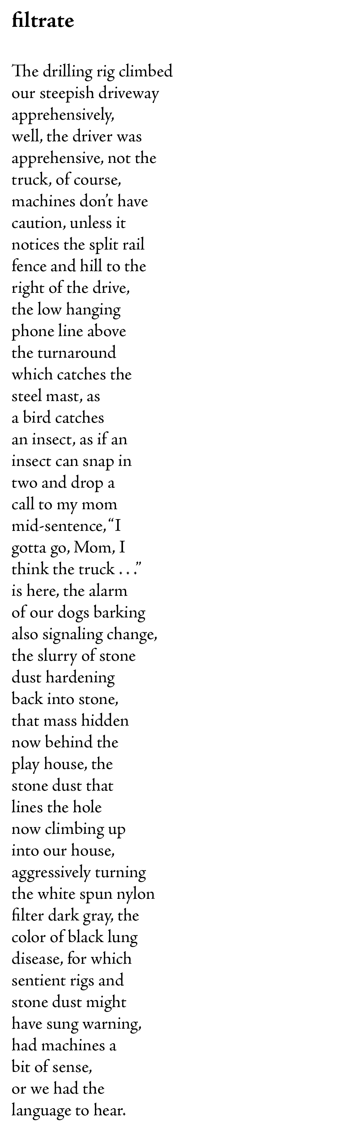 […] still in the works).Likewise, our water filter getting caked with stone dust spurred the poem, “filtrate”.When we bought our house twenty-six years ago, our well failed in the first month. I’m not […]