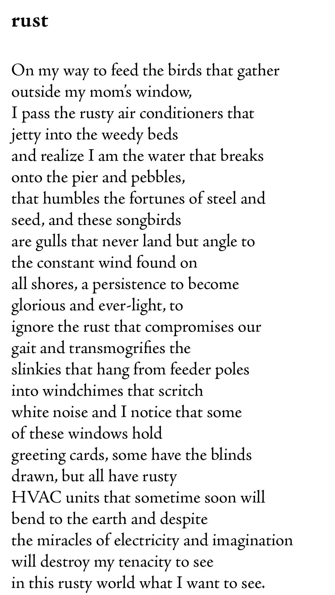 A few weeks ago I took a picture of a rusty air conditioner at the retirement community where my mom lives. I decided today to let this image inspire the poem here, which I rarely do. The poem "The Vulture and the Body" by Ada Limón also helped me get started, not the structure or even the style (which are well worth your time), but the idea of noticing something in your world and using it to reflect on something else. I was filing my mom's bird feeder when I took the picture, and voila, the poem you see here.