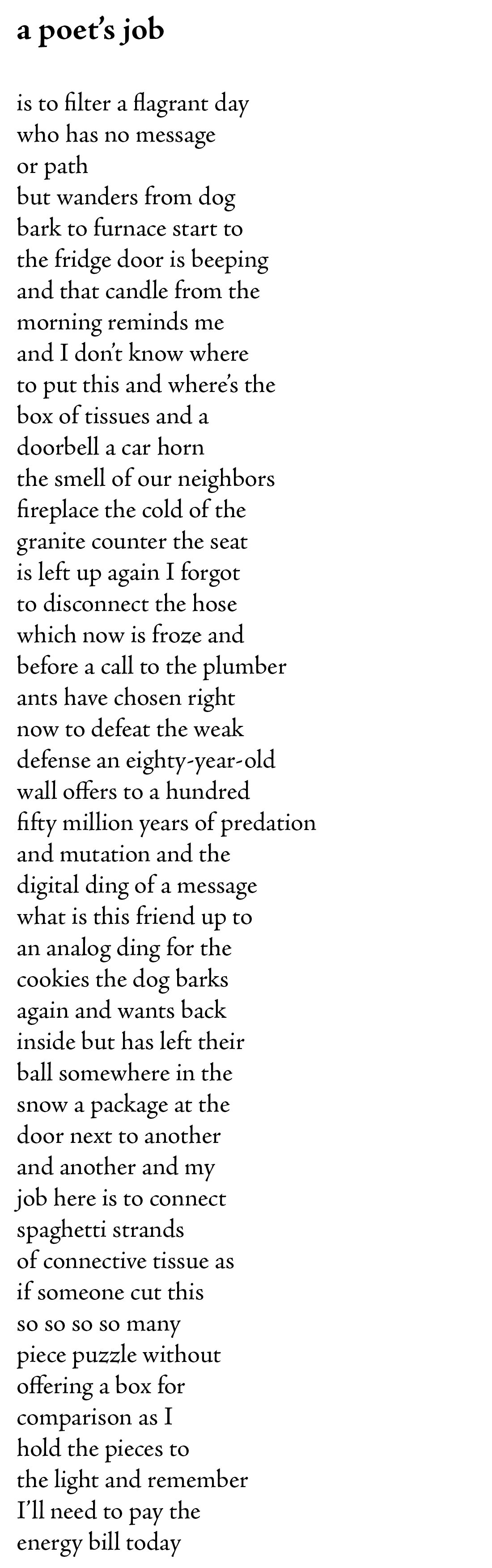 The idea that a poet’s job is to take the crazy commotion of a life and re-frame that life into meaning, something interesting and memorable, something that gives the brief time spent with the poem some richness, something worth spending some time reading, that idea could take a poem a hundred a thousand a million ways.