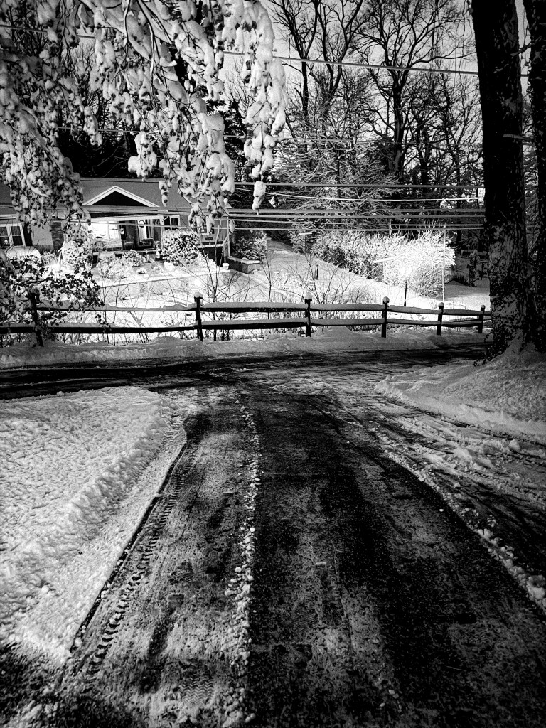 The picture here is a shot after snowplowing last night, the salt I’d just scattered doing its work to bring the black of our driveway back, the lights of our neighbor’s house giving just enough light for a shot at night without a flash.