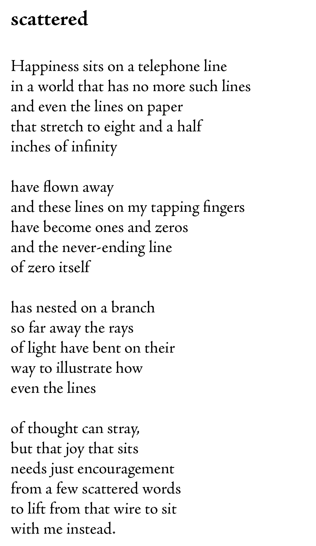 The title of this poem is an apt description of my thoughts this morning, working through the many things I’d like to do today, distracted with snow outside my window and a digital world that keeps knocking.