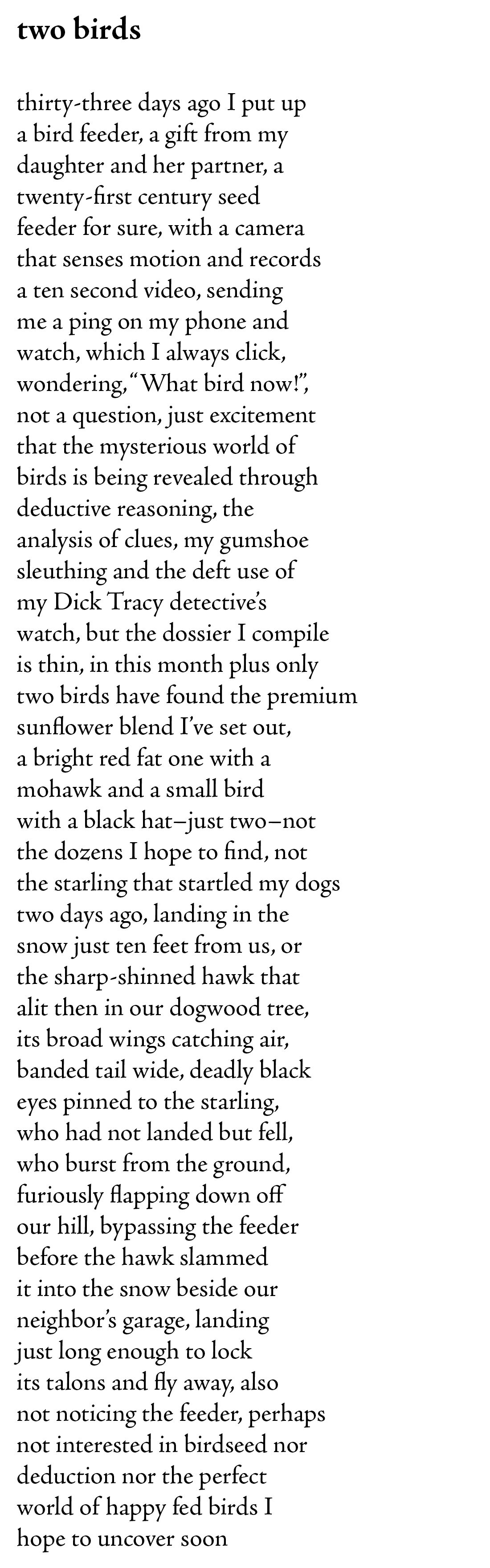 One last note–the title for this poem was the first thing I wrote which has only happened rarely. That it provides such a rewarding summary of the poem, two connected stories each about two birds, was lucky though also, to me, the perfect title for this poem.