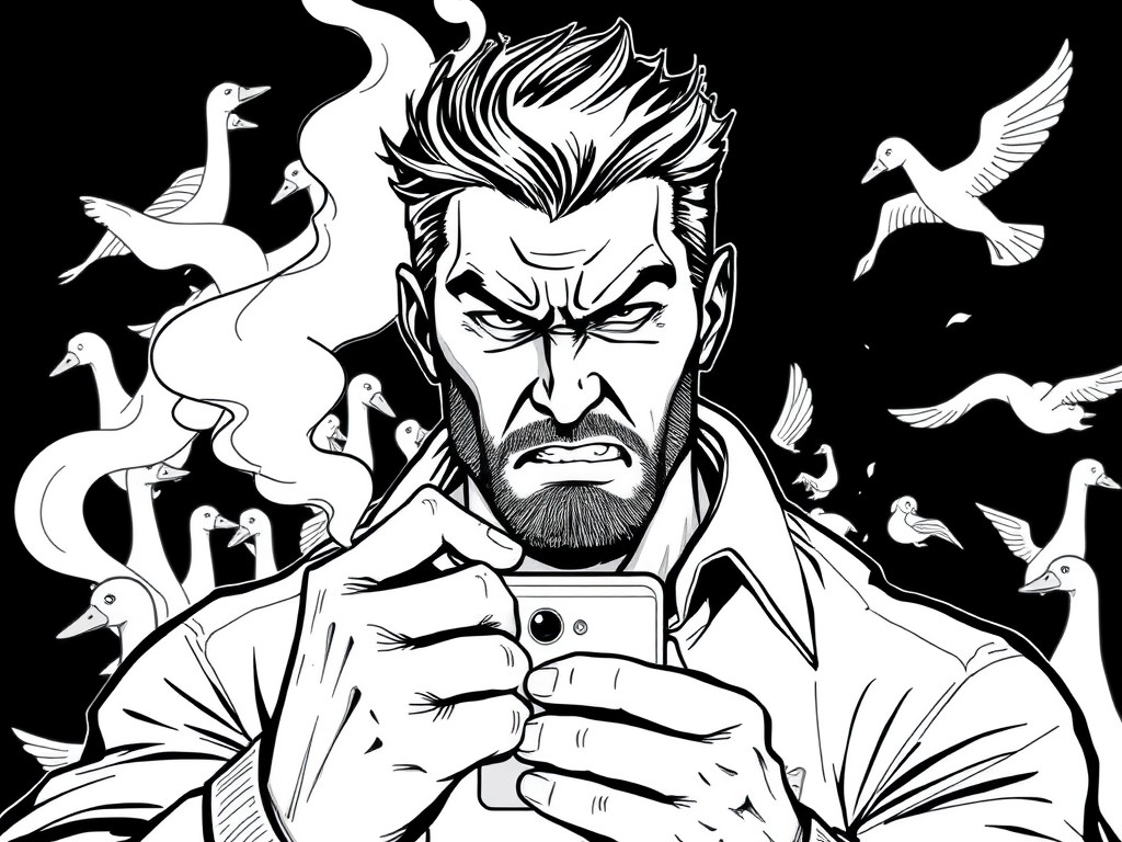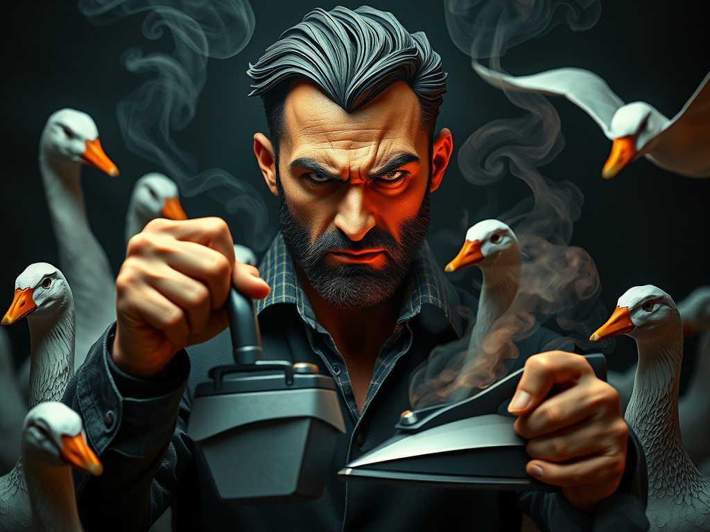 I offered the poem to WordPress’s AI image generator and got quite a few amusing images, mostly a menacing man with geese behind him either holding a clothes iron or what looks to be a gun.