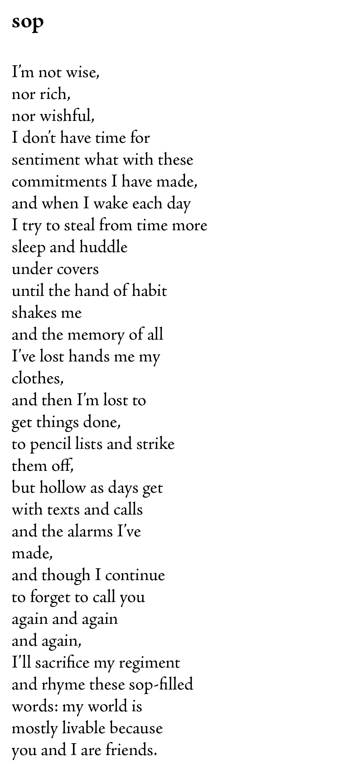 I gave up fighting myself on this one, trying to steer it away from the lyricism and the sentiment, trying not to say something so simple as “my world is/mostly livable because/you and I are friends.”