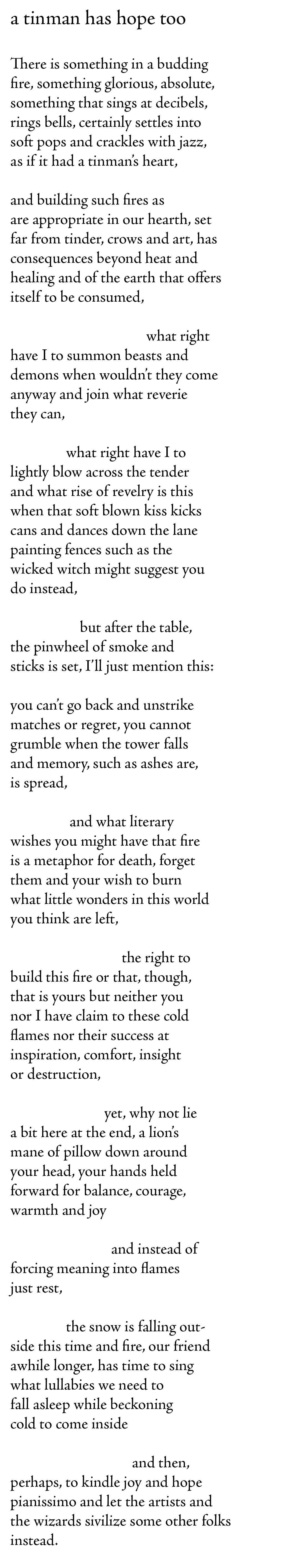 […] top of this there is another layer, though perhaps only I would ever know this. My poem “a tinman has hope too” plays with the words “heart”, “hearth”, “earth”, […]