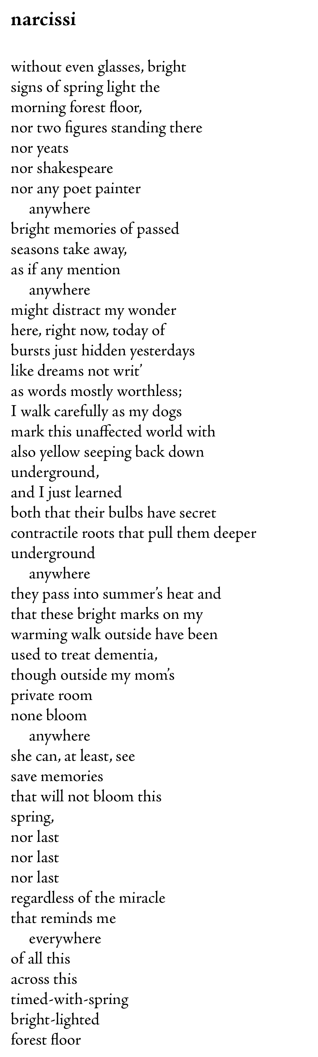 Almost none of my poems bring me to tears when I read them back. My poem “AT” about being a father, my poem “Even I” about my mom’s dementia, and now this poem, “narcissi”, also about my mom’s dementia.