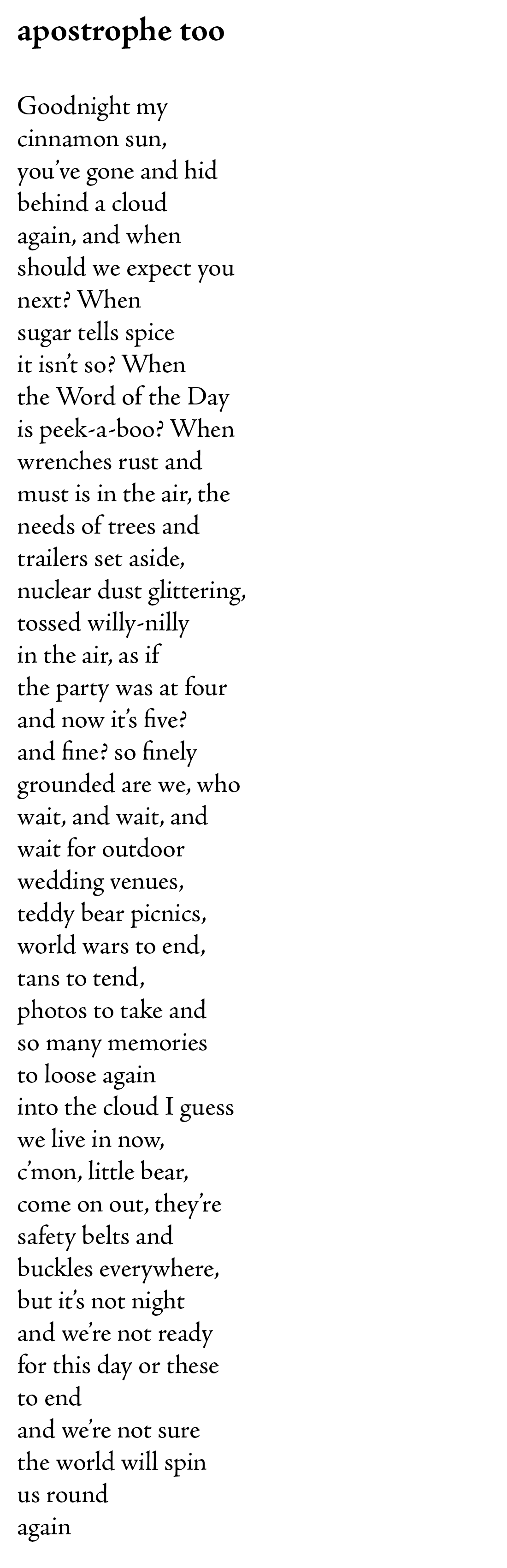 - The line about “nuclear dust glittering” is speaking two-fold, both about the idea of there being smaller elements of all things (nuclear–the powder/dust idea I mentioned above) but also about the dangers of the future, of a possible world war and/or a nuclear war and nuclear winter which would also block out the light of the sun with a type of glittering cloud. The end of the poem where I mention “we’re not ready/for this day or these/to end” is tying that idea down, the chance that the world as we know it will end when the sun disappears for good (these) but also we don’t want this specific day to end, or to say we don’t necessarily want to grow up (this).