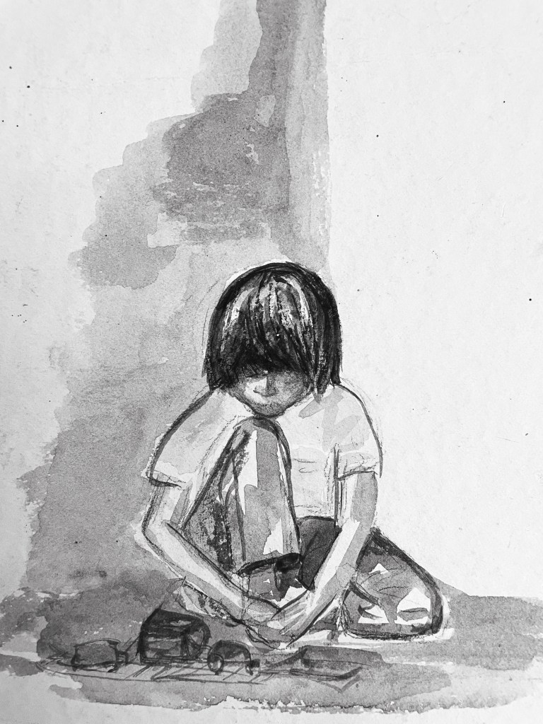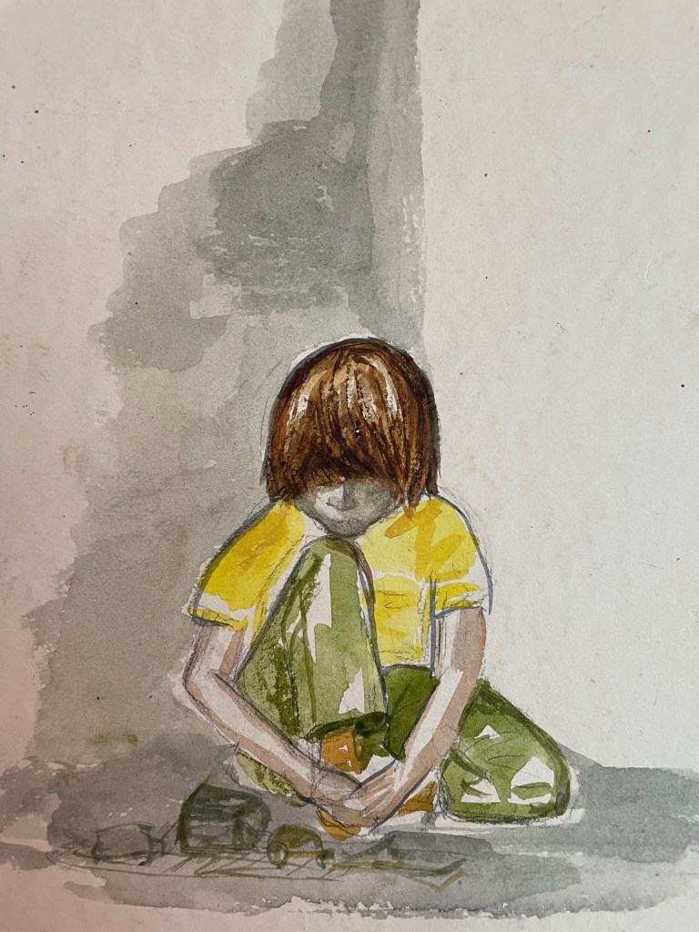 The featured image here is a painting that my mom did of me when I was a kid. The original (below) is in color and honestly, this boy really was me, pulled into myself, insecure, head down, eyes covered in long hair to hide who I really was. Nice job, Mom.