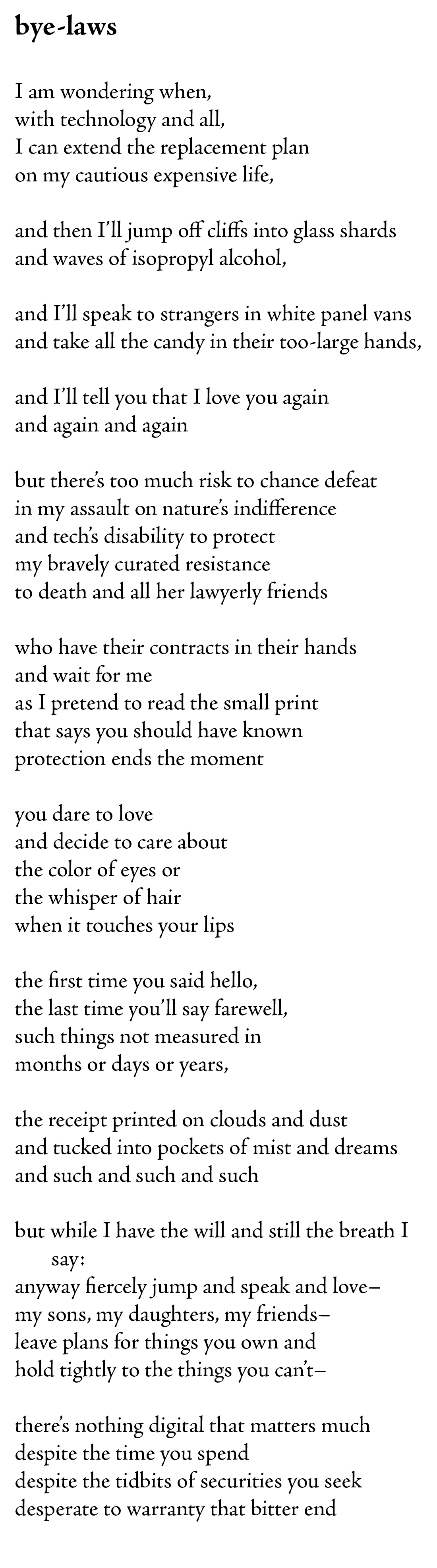 A couple of layers you might easily miss–the use of the word “bit” in the last stanza which along with the direct meanings here is an echo of the bits and bytes that make up our digital life. Also the line, “but while I have the will and still the breath to say” my use of the word “will” is also meant to speak about the legal will that most of us leave to make sure the government is satisfied with our version of how we want our estates to be divided among our survivors.