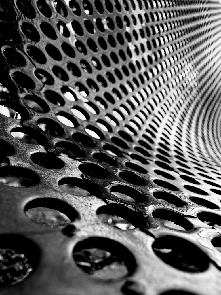 The park was small and the grass was uncut, but the benches were just asking to be part of a picture I might use here. I love how the holes/circles bend and twist away into lines of white and black.