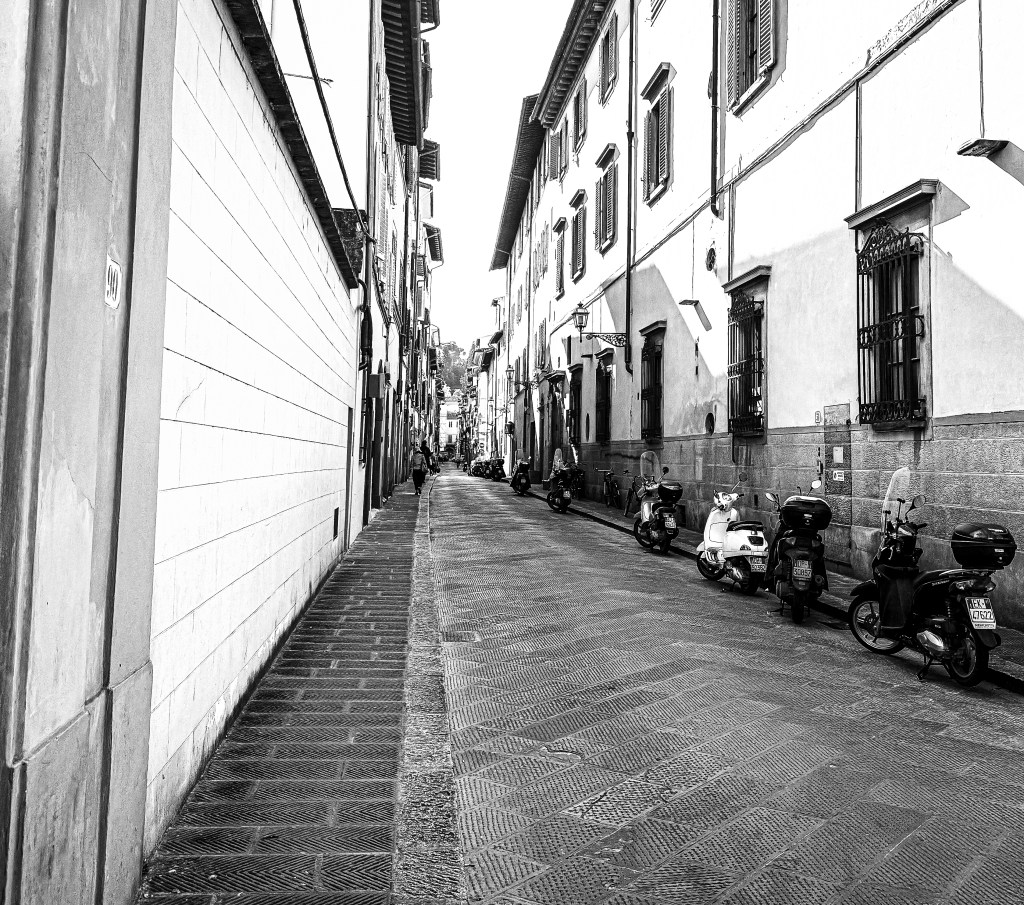 I took the featured image on a street in Florence, Italy which my photo app tells me is “Centro Storico”. I remember being struck at that moment with the qualities of the sidewalk and road, the texture and the lines that are etched into the blocks themselves. The street seems to curve a bit toward the vanishing point–an optical misrepresentation likely from the use of my phone as a camera–but still a layer of complication that I find appealing.