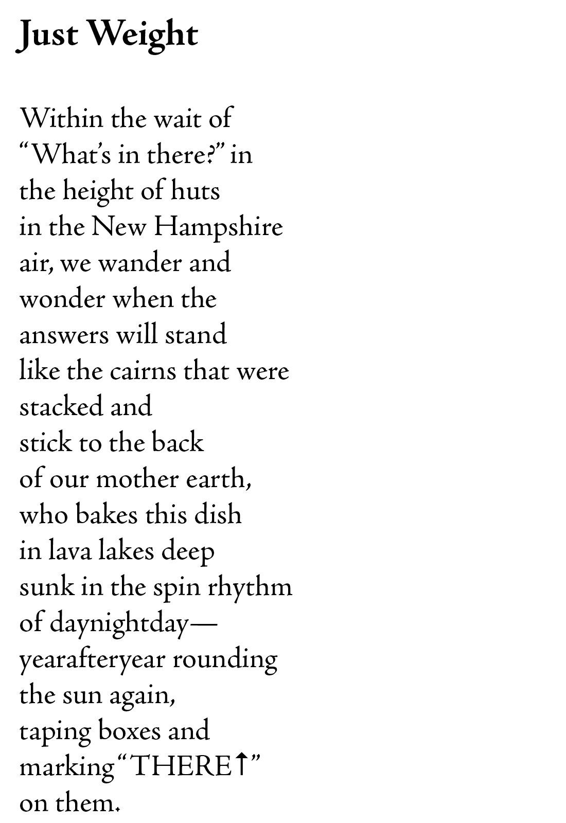 Also, the idea of having a question within the poem itself. Here the answer to that question–“What’s in there?”–is the title of the poem–“Just Weight”.