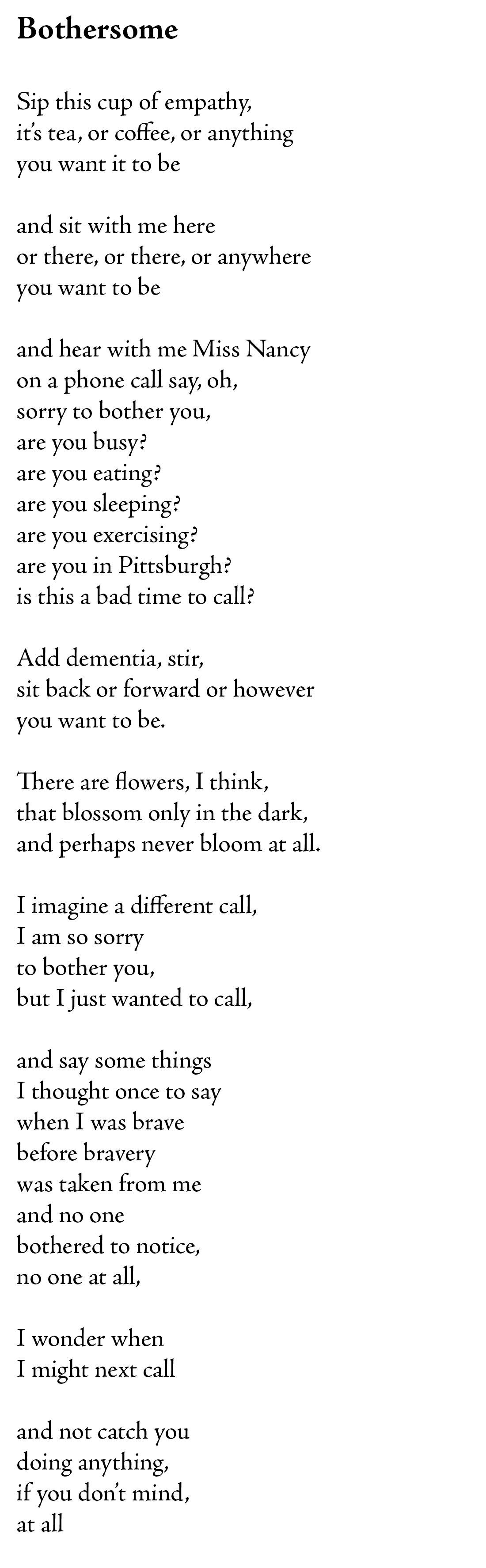 This poem, “Bothersome”, is another in my series of poems on memory loss. It is also posted on Substack, where I have a small following and where I am posting a Wednesday poem and blog about my experience supporting my mom through this all-to-common type of memory loss.