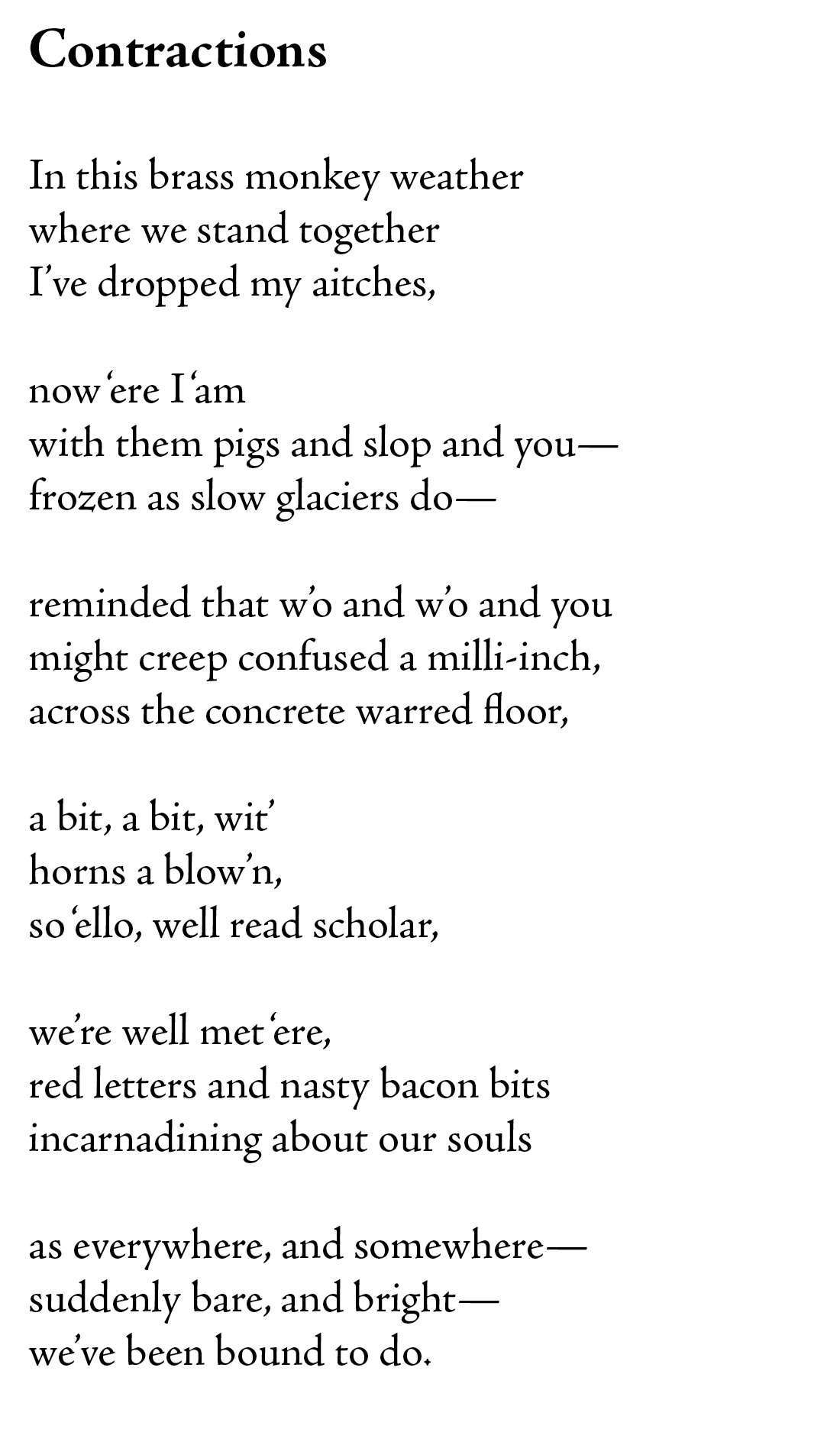 This is the best title I’ve ever used for a poem. “Contractions” works on so many levels that pertain to the poem and enriches the poem itself through connecting them, summarizing them here in the start of the poem.