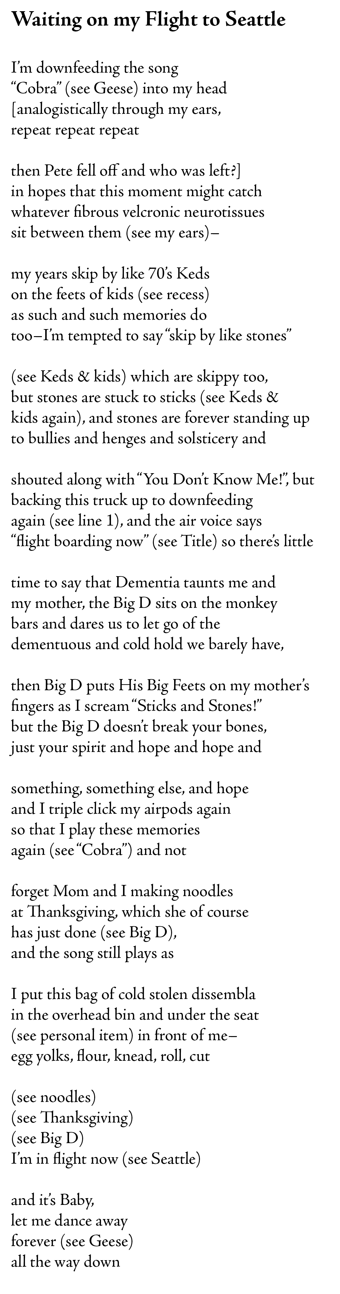 Downloading was the start of the entire poem, the word that brought the whole thing to life on the page. I was waiting for our flight to Seattle (see Title). My son had just sent me the song “Cobra” by the band Geese and I was listening to it on repeat. And that process felt like a download into my brain.